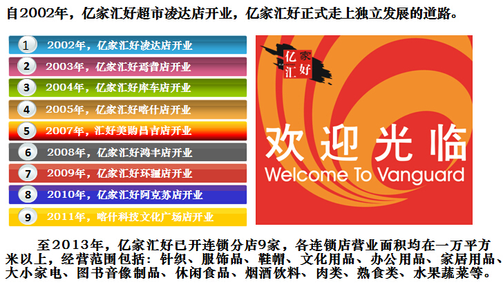 億家匯好商貿(mào)有限責(zé)任公司于2002年成立,并從臺灣引進連鎖經(jīng)營職業(yè)管理團隊,統(tǒng)一管理旗下各地的連鎖超市。公司通過多年的穩(wěn)健發(fā)展,至2013年底,億家匯好商貿(mào)有限責(zé)任公司已成為擁有員工近3000多人,下轄一個配送中心和9家連鎖超市的大型綜合性零售企業(yè)??偨?jīng)營面積11萬多平方米,配送中心輻射公司所有超市,年配送額可達2億元。公司大量吸納下崗職工,經(jīng)過崗前培訓(xùn),提高勞動技能,實現(xiàn)了他們的再就業(yè),為維護社會和諧穩(wěn)定做出了貢獻。2013年,巴州億家匯好商貿(mào)有限責(zé)任公司在自治區(qū)零售業(yè)中穩(wěn)踞前三位,是自治區(qū)重要的流通龍頭企業(yè),2013年年銷售收入達10億人民幣。多年來,公司一直重管理、抓實效、運用先進的管理手段和營銷理念,秉承億家匯好人 時時尋求效率創(chuàng)新,事事講究專業(yè)技術(shù)的文化精髓,創(chuàng)造了良好的經(jīng)濟效益和社會效益。公司先后多次被消費者協(xié)會評為誠信單位,并多年被評為重合同,守信用單位。